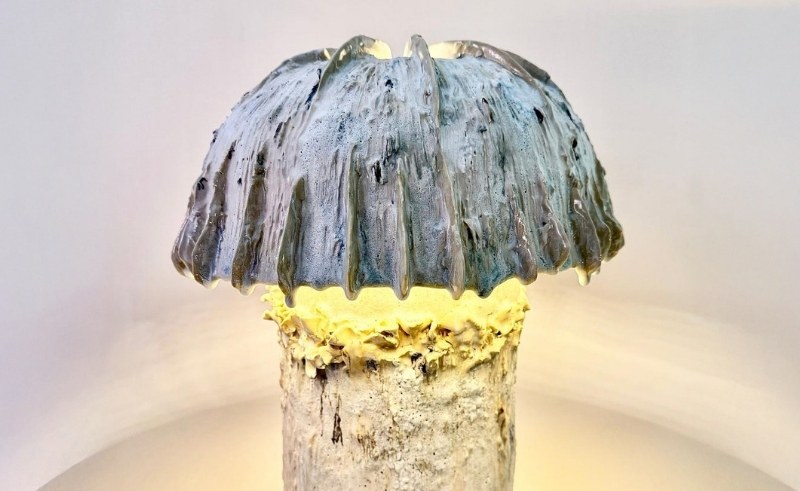 The Shining Shiitake came from the same research, the same obsession, the same need to tell the story differently. They are lamps, but they are also sculptures. By day, they sit on walls or tables, textured and coloured, mushroom-formed, playful. By night, they glow. The light is amber, warm, contained. It emanates from the underside, from the gills, from the places you would not expect.